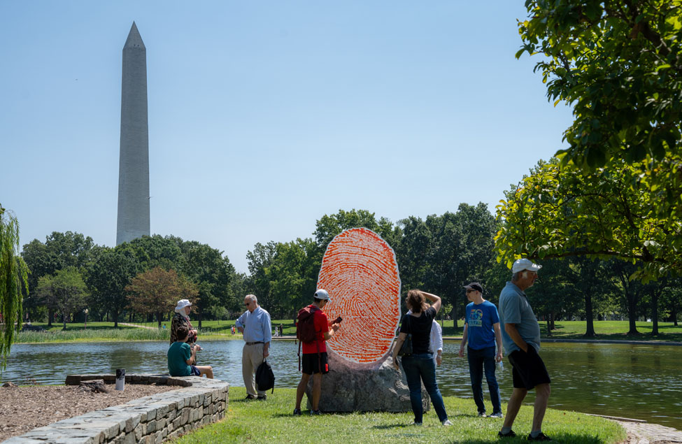 Later in the month, Wendy Red Star held a conversation on indigenous legacies and how those histories are preserved and shared that gave more resonance to her piece, The Soil You See…. This monumental thumbprint with the names of Crow chiefs who signed treaties with the U.S. Government was located next to the 56 Signers of the Declaration of Independence memorial in Constitution Gardens.