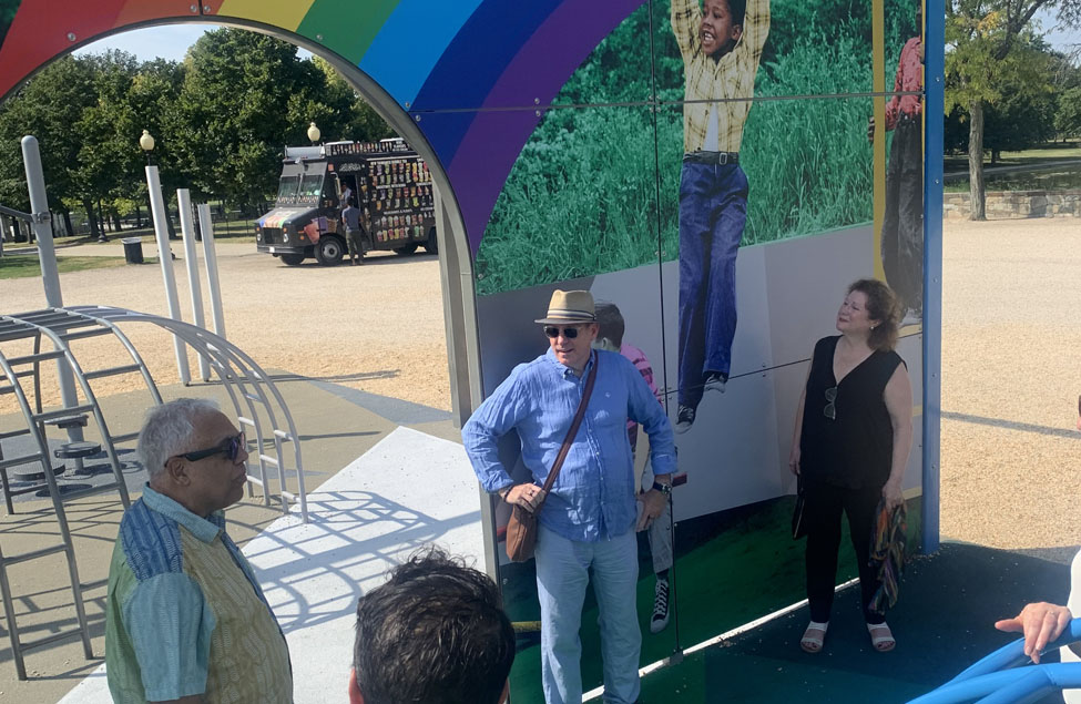 Derrick Adams held a “Play Day” at America’s Playground: DC, activating the immediately well-loved and well-used jungle-gym with music, bubbles, hula-hoops, double-dutch jump roping, and ice cream – all important elements for a fun day on the Mall. This joyful engagement provided a juxtaposition to the artwork’s focus on desegregated public spaces in our nation’s capital.